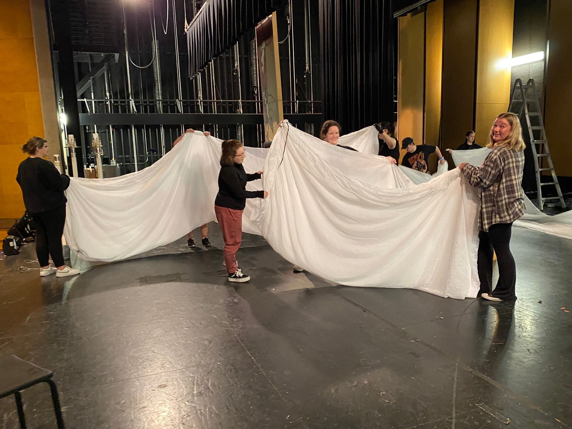 - Sixteen line sets with a fly space 47’ tall are in place for floating backdrops